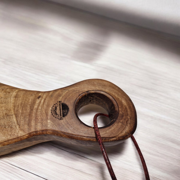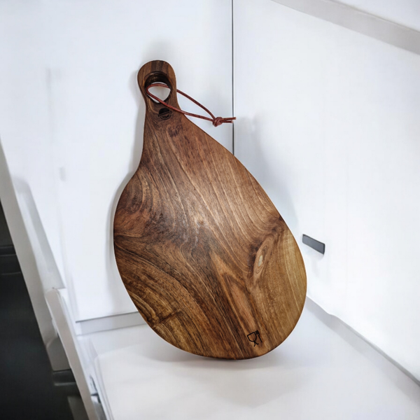 Fabriquée en noyer massif, cette planche est prévue pour le contact alimentaire. Excellente prise en main par sa poignée ergonomique, munie d'une lanière en cuir véritable.