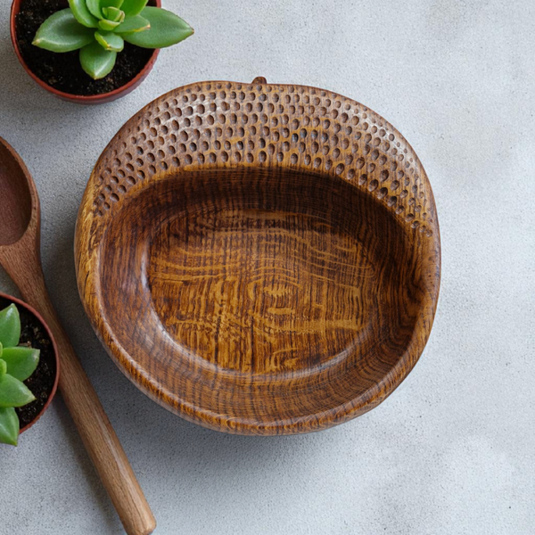 Entièrement sculpté à la main dans du chêne massif, chaque détail a été pensé pour reproduire fidèlement la forme délicate d'une noisette, faisant de ce saladier bien plus qu'un simple ustensile de cuisine. Avec ses dimensions généreuses (250 mm de diamètre extérieur et 70 mm de haut extérieur), il est parfait pour accueillir vos salades les plus gourmandes, des fruits ou fruits secs.